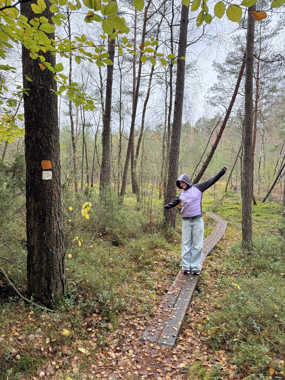 Väl uppe beundrade vi utsikten över trädtopparna innan vi tog oss ned på andra sidan. Strax nådde vi Röge å, som porlar fram och ger en närmast tropisk känsla med trädgrenar som hänger ut över vattnet och ormbundar som växer längs stigen. Vi tog en fikapaus vid ån och njöt i solen en stund, innan vi fortsatte längs ån tillbaka mot startpunkten. En perfekt liten förmiddagsvandring med andra ord!