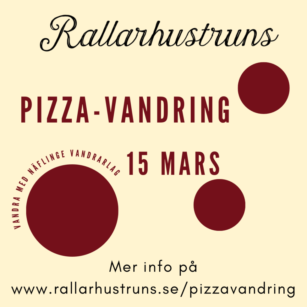 Den 15 mars kör vi igen! Näflinge vandrarlag bjuder int ill ännu en härlig Pizzavandring. Vi vandrar total ca 10 km och turen inkluderar både ljuvlig stenugnspizza på Rallarhustruns & gofika hos Asmoarp Natur!